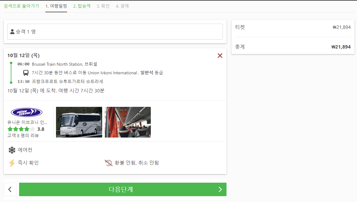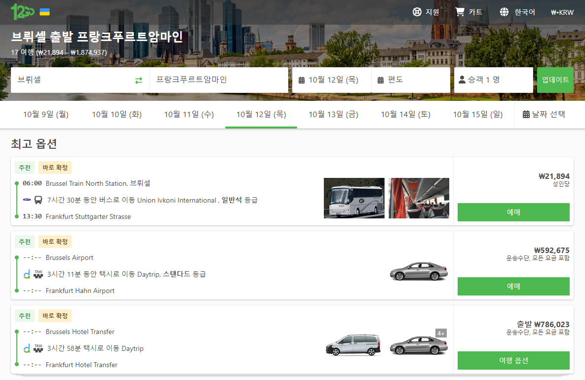 암스테르담에서 프랑크푸르트로 이동하는 교통편 노선정보 및 예약은 12go사이트에서 예약하실 수 있으며, 이 노선 뿐만아니라 나라전역의 노선, 나라간 노선의 검색가능한 모든 교통편을 검색하고 예약하실 수 있습니다. 한국어로 검색해보시고 나오지 않으면 영어로 검색하시면 보다 쉽게 노선을 확인하실 수 있습니다.