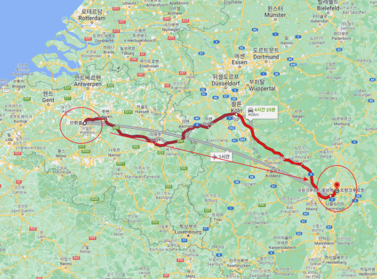 또한, 기차나 비행기를 이용하는 경우에는 그 시간이 달라질 수 있습니다. 예를 들어, 암스테르담과 프랑크푸르트 사이를 운항하는 비행기는 일반적으로 약 1시간 반을 소요하며, 고속열차(Eurostar) 는 약 4시간을 소요합니다.