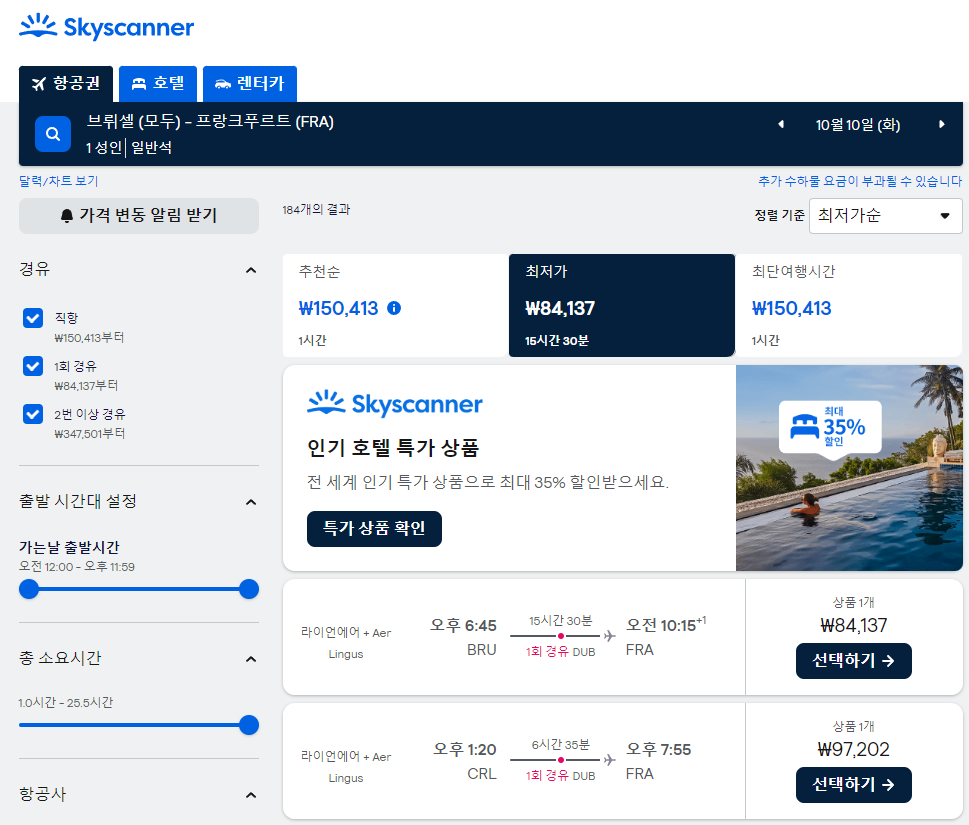 스카이 스캐너 사이트에서 암스테르담에서 프랑크푸르트로 이동하는