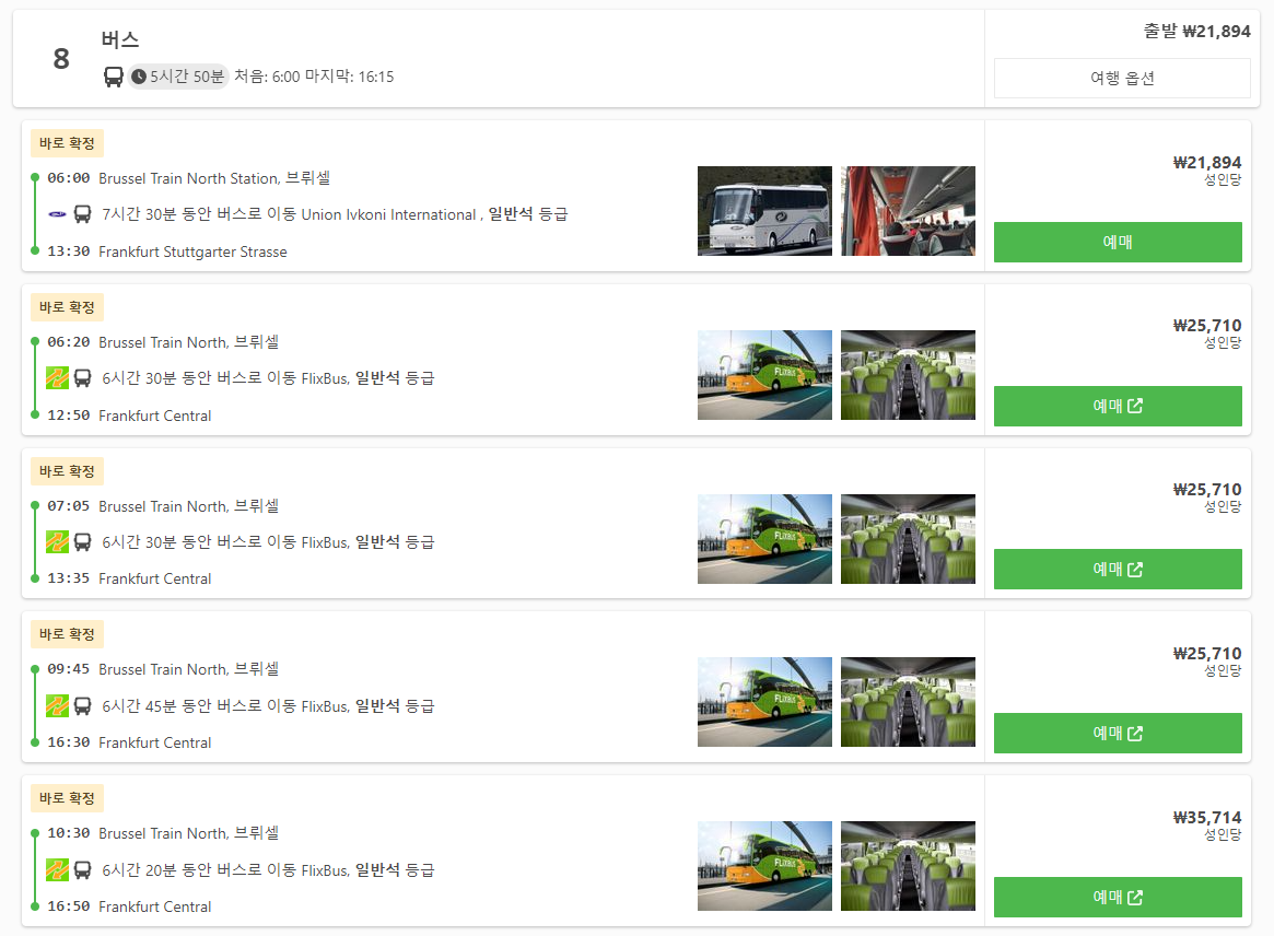 암스테르담에서 프랑크푸르트로 이동하는 버스는 하루 평균 8대정도 운행하며 오전 6시부터 16시대까지 다양합니다. 출발지와 도착지 터미널 또는 정류장은 예매를 누르고 나오는 다음페이지에서 확인하실 수 있습니다. 이동시간은 최소 5시간 50분이상이며 최저요금은 2만원대부터입니다.