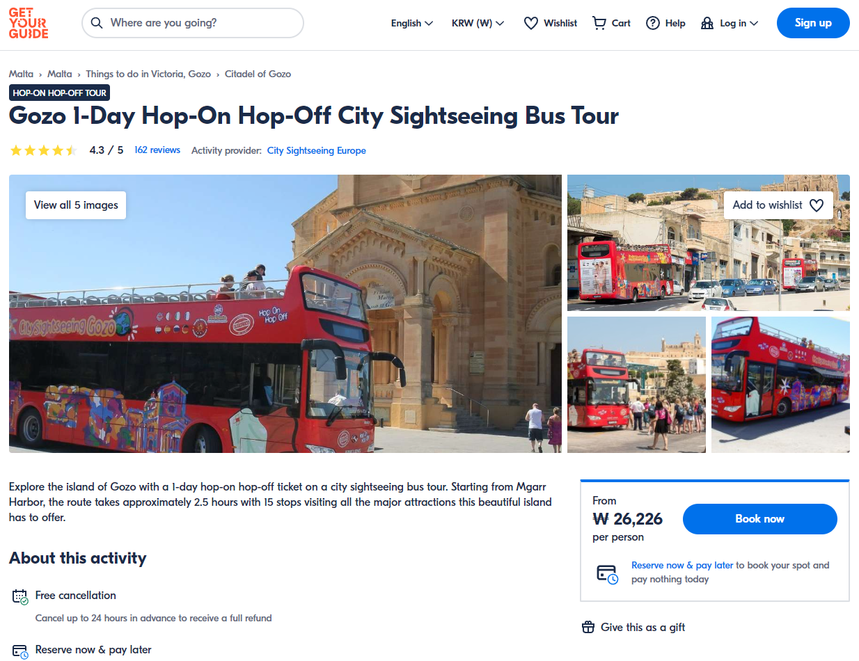 몰타 고조섬 시티투어버스는 GET YOUR GUIDE 사이트에서 예약하실 수 있습니다. 사이트는 특히 전세계 대부분의 나라, 지역의 투어, 교통편 있어, 쉽게 찾을 수 없는 여행지의 다양한 투어 및 서비스를 이용할 수 있는 글로벌 사이트로 한국어사이트는 지원하지 않습니다. (글로벌 한국어 여행사이트를 찾으신다면 klook 여행사이트 추천합니다. 함께 사용하시면 더욱 편하게 여행하실 수 있습니다. klook에 찾는 정보가 없다면 GET YOUR GUIDE에서 찾으시면 됩니다.)