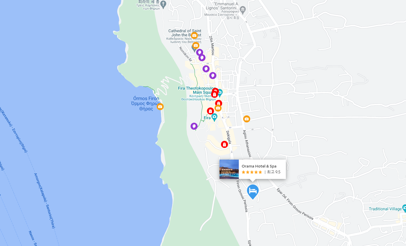 산토리니여행에 메인도시 피라(Fira)에 위치한 화려하고 현대적이며 깨끗한 오라마 호텔 & 스파(Orama Hotel & Spa)의 아름다운 시설과 전망을 즐겨보세요~ 오라마 호텔 & 스파(Orama Hotel & Spa)는 피라시내에서 조금 떨어진 곳에 위치해 조용하게 휴식을 취하기 좋은 곳으로 피라시내가 도보로 10분거리인 만큼 불편함없이 시내도 즐기기 좋습니다.