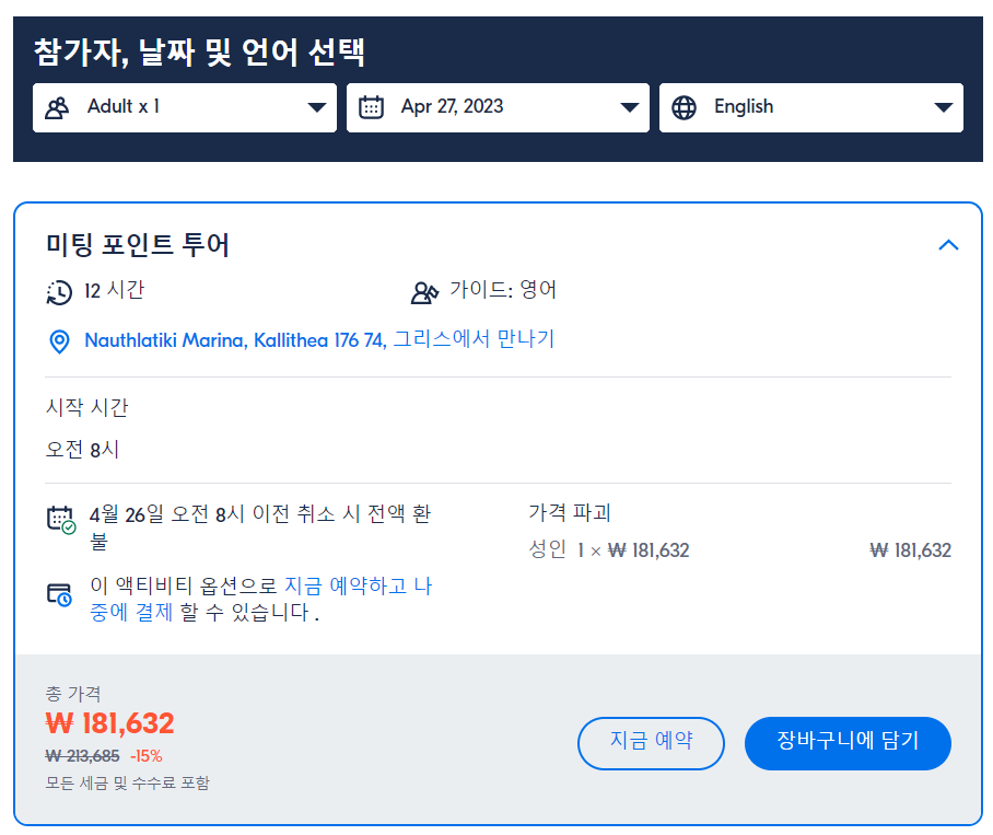 만남의 장소는 Marina Kallitheas 항구입니다. 자세한 내용은 활동 제공자에게 문의하십시오.