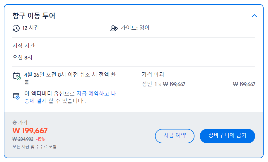 그리고 한국인들이 많이 참여하는 투어보다 다양한 나라의 사람들이 많이 참여하는 만큼 다른사람들 시선을 신경쓰지 않고 편하게 여행을 즐기길 원하는 사람들에게 더욱 추천합니다. 한국어로 쉽게 예약할 수 있고 한국분들이 많이 참여하는 투어는 klook 여행사이트에 예약하시고 한국분들 많이 참여하지 않는 현지투어의 분위기를 좋아하시는 분들은 GET YOUR GUIDE에 예약하시면 됩니다.