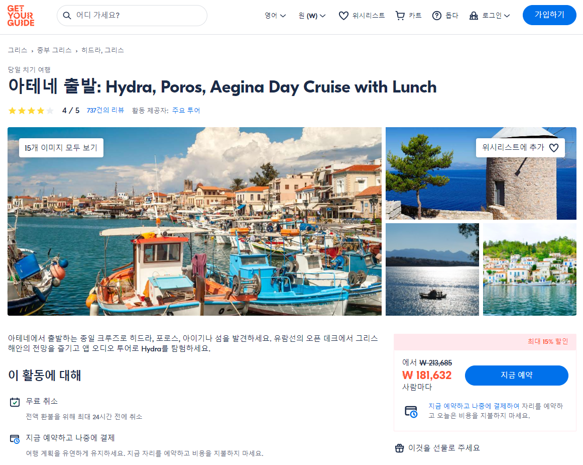 아테네에서 출발하는 히드라, 포로스, 아이기나섬 종일 크루즈 투어는 GET YOUR GUIDE 사이트에서 예약하실 수 있습니다. 사이트는 특히 전세계 대부분의 나라, 지역의 투어, 교통편 있어, 쉽게 찾을 수 없는 여행지의 다양한 투어 및 서비스를 이용할 수 있는 글로벌 사이트로 한국어사이트는 지원하지 않습니다. (글로벌 한국어 여행사이트를 찾으신다면 klook 여행사이트 추천합니다. 함께 사용하시면 더욱 편하게 여행하실 수 있습니다. klook에 찾는 정보가 없다면 GET YOUR GUIDE에서 찾으시면 됩니다.)