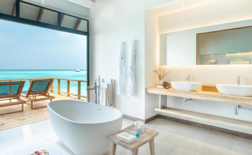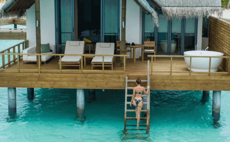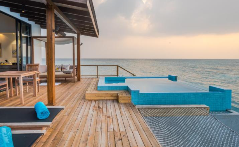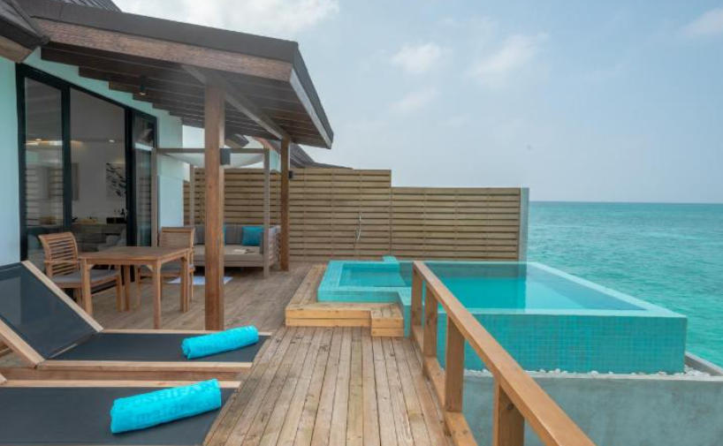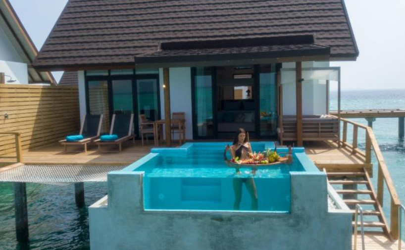 프리미엄 풀 워터 빌라의 수영장은 놀랍고 사방에 바다가 있는 멋진 전망을 가지고 있으며 이 빌라에서 일몰과 일출을 모두 볼 수 있습니다. 이 빌라 아래의 물은 매우 깊고 바위가 있어서 물에 잠기지는 않지만 자쿠지 워터 빌라에서는 특히 썰물 때 물이 그렇게 높지 않아 라군에서 내려갈 수 있고, 물은 하얀 모래로 맑습니다. 물속에서 많은 물고기를 볼수 있고, 상어, 만타 가오리, 돌고래도 발견하실 수 습니다. 리조트의 서비스는 최고 수준입니다.