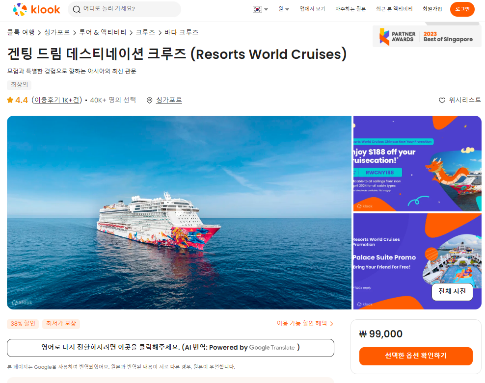 싱가포르여행에 겐팅 드림 데스티네이션 크루즈 (Resorts World Cruises) 예약은 클룩사이트에서 쉽게 예약하실 수 있으며, 현재 할인된 금액에 이용하실 수 있습니다. 내용 및 요금은 항상 변경될 수 있으니 예약사이트에서 정확한 내용을 확인하셔야 합니다.