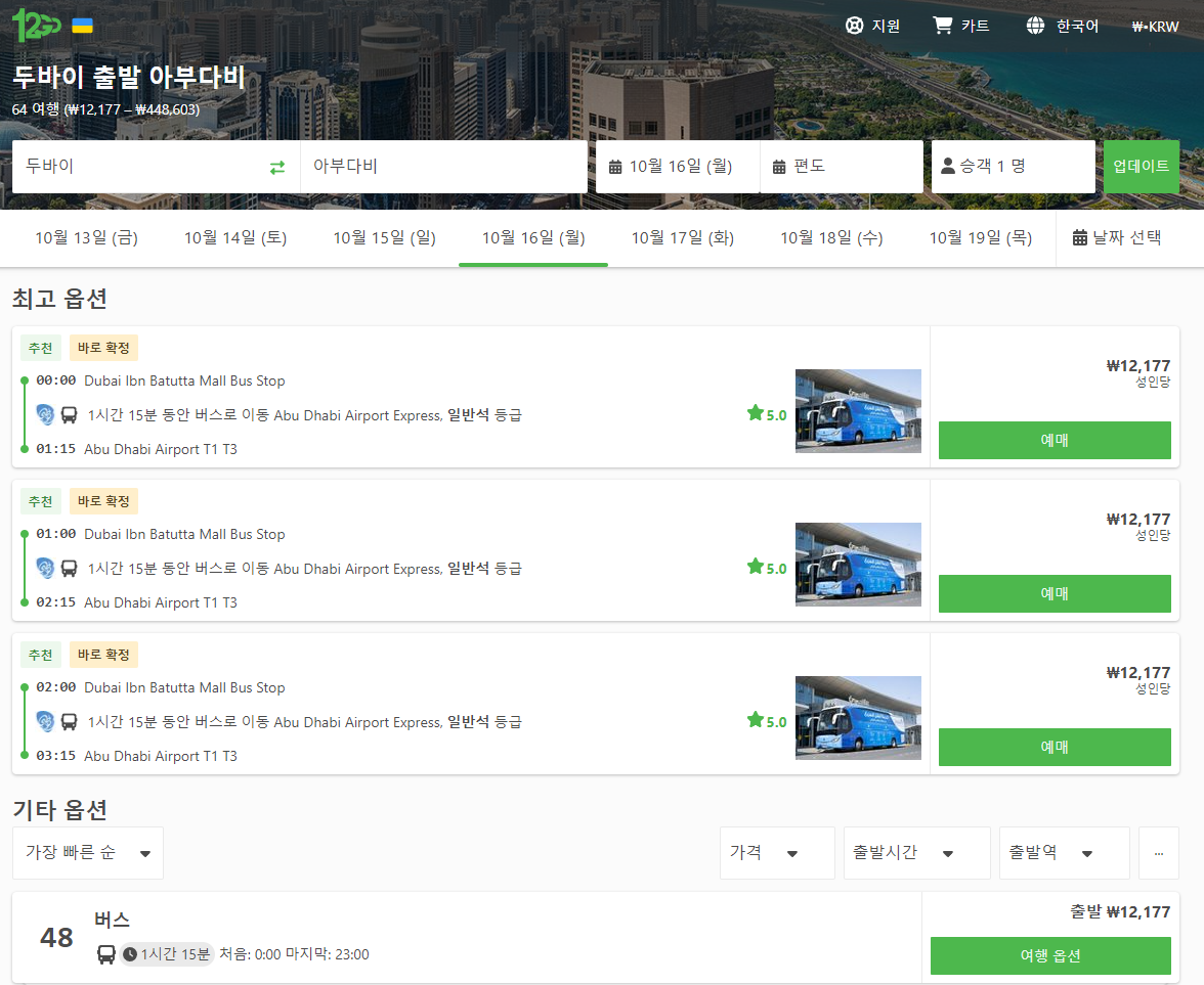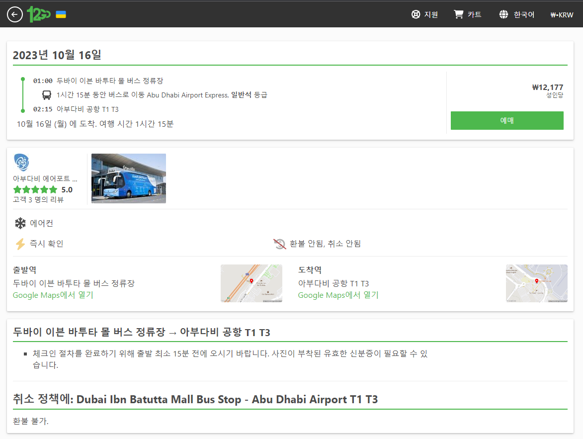 두바이에서 아부다비로 이동하는 교통편 노선정보 및 예약은 12go사이트에서 예약하실 수 있으며, 이 노선 뿐만아니라 나라전역의 노선, 나라간 노선의 검색가능한 모든 교통편을 검색하고 예약하실 수 있습니다. 한국어로 검색해보시고 나오지 않으면 영어로 검색하시면 보다 쉽게 노선을 확인하실 수 있습니다.