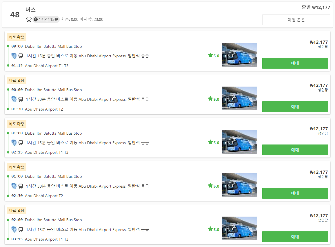 두바이에서 아부다비로 가는 버스는 최소시간 1시간 15분이상 소요되며 Dubai Ibn Batutta Mall Bus Stop에서 Abu Dhabi Airport T1 T3, Abu Dhabi Airport T2로 이동하는 노선이 있습니다. 버스요금은 1만원대이며 하루종일 평균 40편이상 운행하는 만큼 원하는 시간대에 온라인으로 예약하고 이동이 가능합니다.
