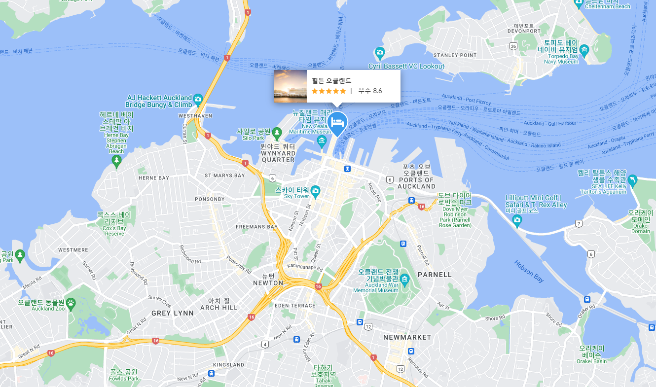 오클랜드여행의 추천하는 물 위의 아름다운 호텔 힐튼 오클랜드 (Hilton Auckland)는 멋진 전망을 자랑하며 넓은 발코니와 멋진 크기의 욕조가 있는 깨끗한 객실을 갖추고 있습니다. 2019년에 리모델링되었으며 모든 레스토랑과 상점까지 도보로 다닐수 있습니다. 다운타운 페리 터미널이 호텔에서 도보로 단 5분 거리에 있어 Waiheke를 방문할 계획이 있다면 좋은 호텔입니다. 호텔이 위치한 복합 단지에는 편의점과 다양한 레스토랑이 있습니다.