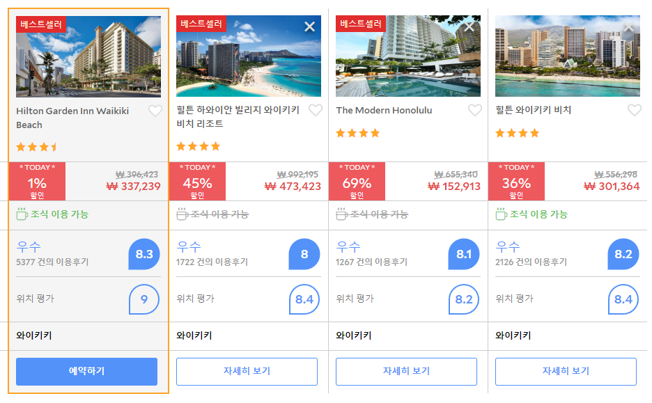 하와이호텔 힐튼 가든 인 와이키키 비치(Hilton Garden Inn Waikiki Beach)의 최저 가격대는 아고다웹사이트에서 할인특가 가격으로 매일매일 변동되며 10만원대부터 다양하게 형성됩니다. 날짜별로 매일 가격이 다르므로 아고다웹사이트 최저가를 확인하시려면 아래 링크를 누르시고 원하는 날짜의 가격대를 선택해야 정확한 가격을 자세히 보실 수 있습니다.