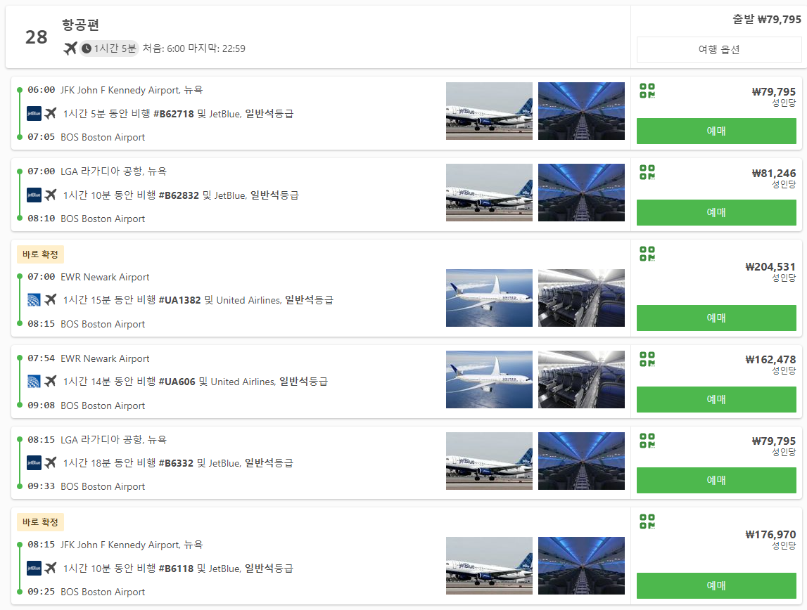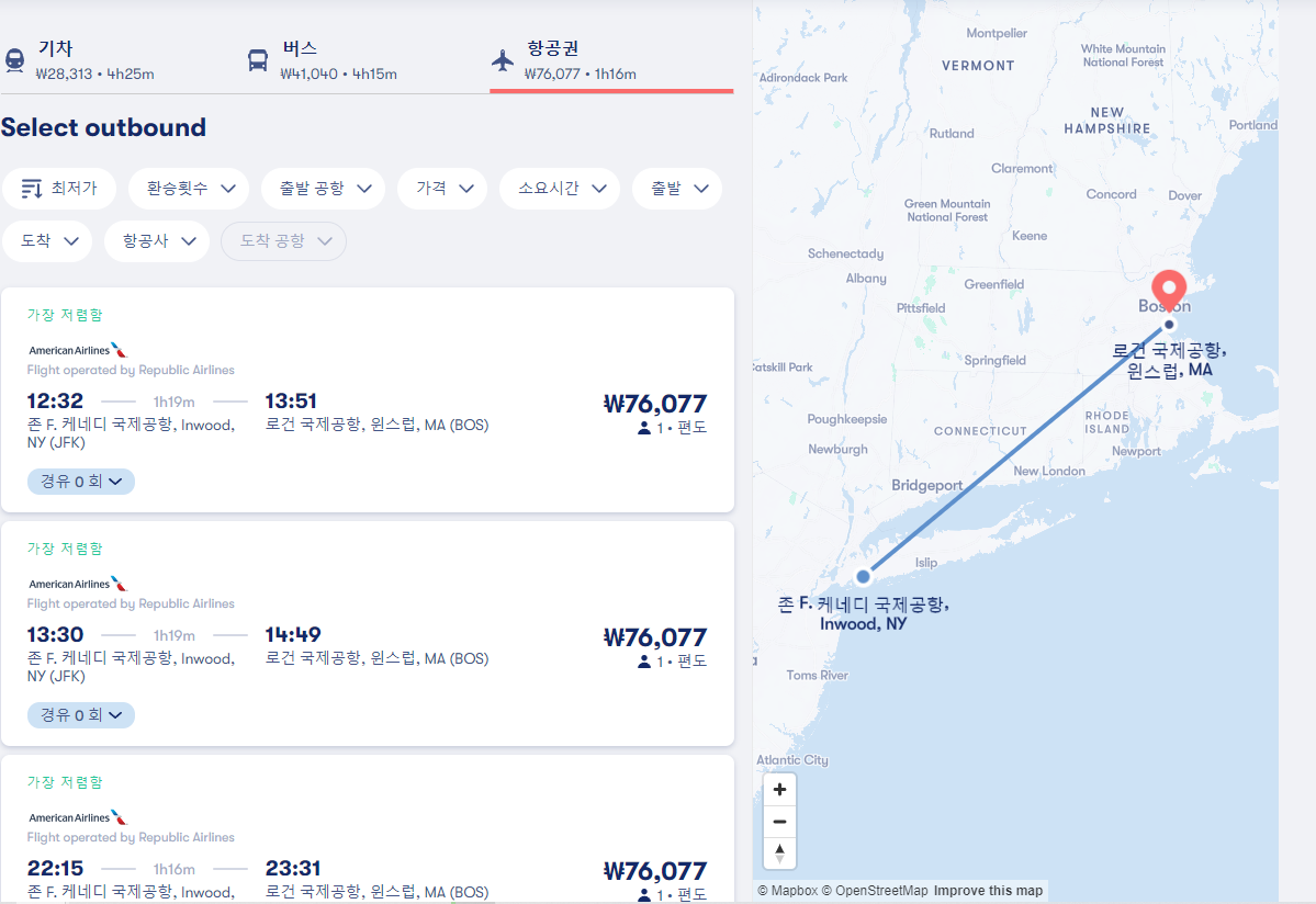 뉴욕에서 보스턴으로 가는 항공은 최저가요금 7만원대부터 시작하며 이동시간은 1시간이 약간 넘습니다.