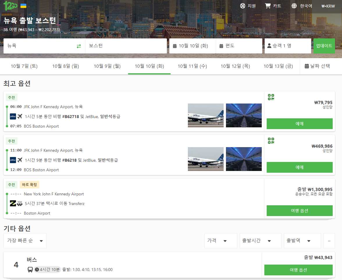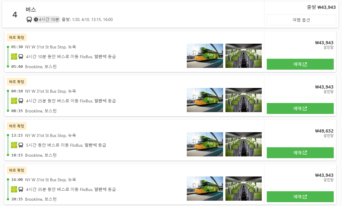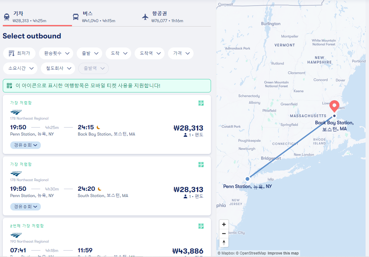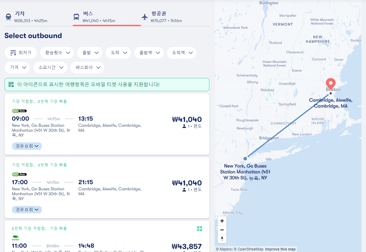 뉴욕에서 보스턴으로 가는 교통편 노선정보 및 예약은 12go사이트, omio 사이트에서 예약하실 수 있으며, 이 노선 뿐만아니라 나라전역의 노선, 나라간 노선의 검색가능한 모든 교통편을 검색하고 예약하실 수 있습니다. 한국어로 검색해보시고 나오지 않으면 영어로 검색하시면 보다 쉽게 노선을 확인하실 수 있습니다.