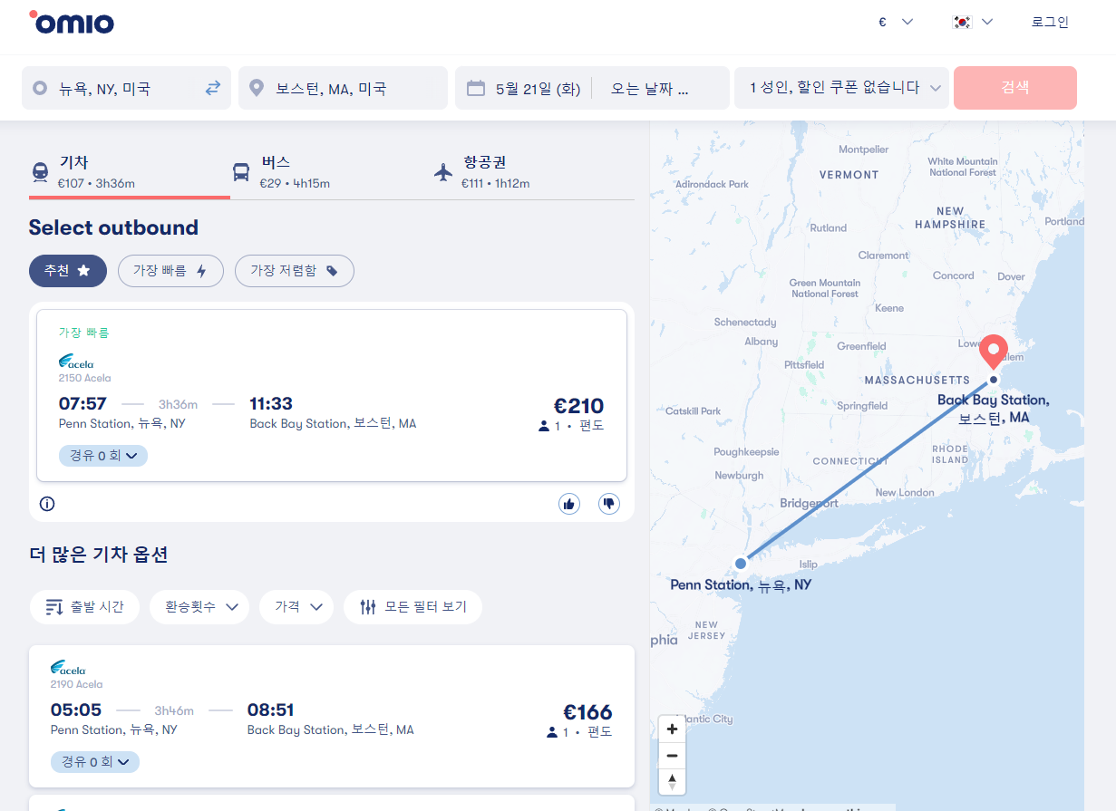 omio 사이트에서 뉴욕에서 보스턴으로 가는