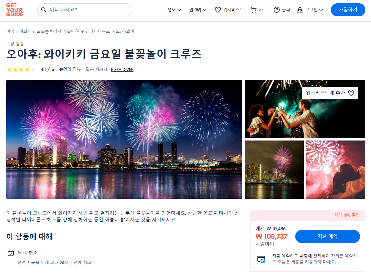 오아후 와이키키 금요일 불꽃놀이 크루즈 (Oahu Waikiki Friday Fireworks Cruise)는 GET YOUR GUIDE 사이트에서 예약하실 수 있습니다. 사이트는 특히 전세계 대부분의 나라, 지역의 투어, 교통편 있어, 쉽게 찾을 수 없는 여행지의 다양한 투어 및 서비스를 이용할 수 있는 글로벌 사이트로 한국어사이트는 지원하지 않습니다. (글로벌 한국어 여행사이트를 찾으신다면 klook 여행사이트 추천합니다. 함께 사용하시면 더욱 편하게 여행하실 수 있습니다. klook에 찾는 정보가 없다면 GET YOUR GUIDE에서 찾으시면 됩니다.)