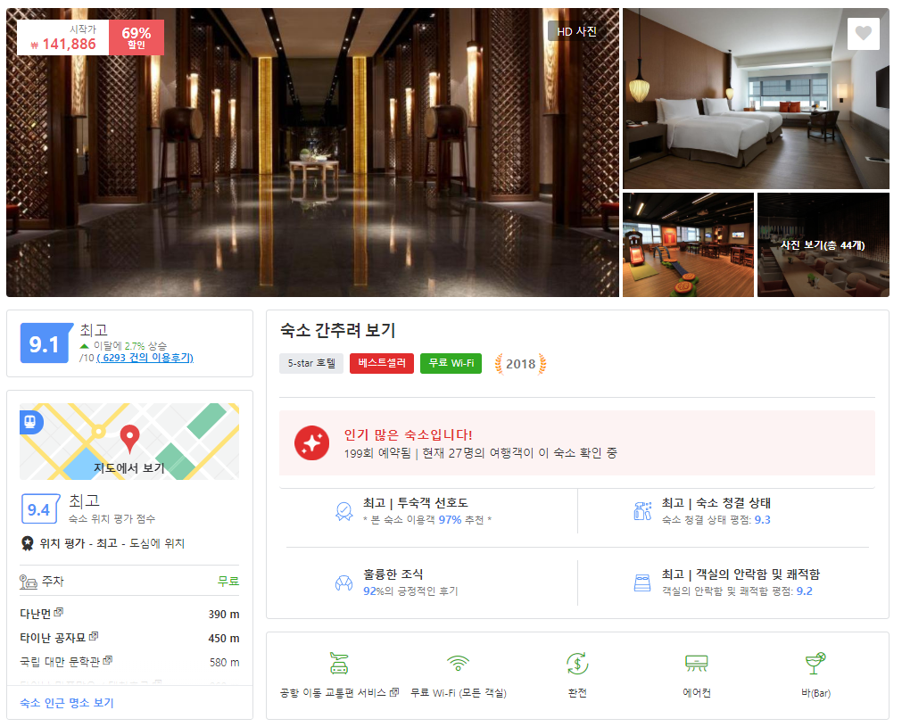 이정도 가격에 라운지 이용까지... 음식도 맛있고, 위치도 관광, 쇼핑 모두에 좋습니다. 타이난 5성급 호텔 중 크라운 플라자 제외하면 제일 최근에 지어진 것으로 알고 있습니다. 재방문 의사 있습니다.