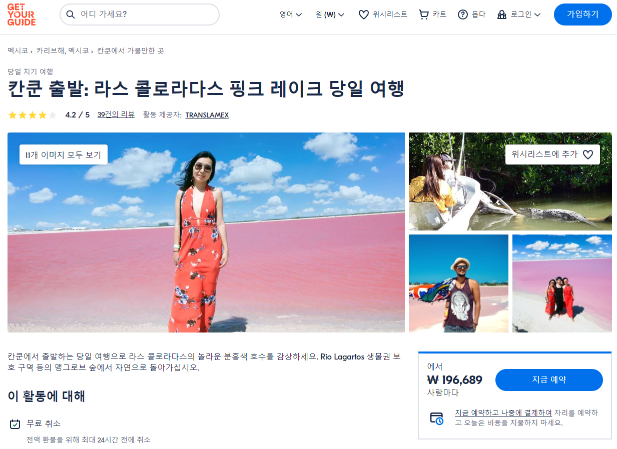 칸쿤출발 라스 콜로라다스 핑크 레이크 당일 여행(From Cancun Day Trip to Las Coloradas Pink Lakes)는 GET YOUR GUIDE 사이트에서 예약하실 수 있습니다. 사이트는 특히 전세계 대부분의 나라, 지역의 투어, 교통편 있어, 쉽게 찾을 수 없는 여행지의 다양한 투어 및 서비스를 이용할 수 있는 글로벌 사이트로 한국어사이트는 지원하지 않습니다. (글로벌 한국어 여행사이트를 찾으신다면 klook 여행사이트 추천합니다. 함께 사용하시면 더욱 편하게 여행하실 수 있습니다. klook에 찾는 정보가 없다면 GET YOUR GUIDE에서 찾으시면 됩니다.)