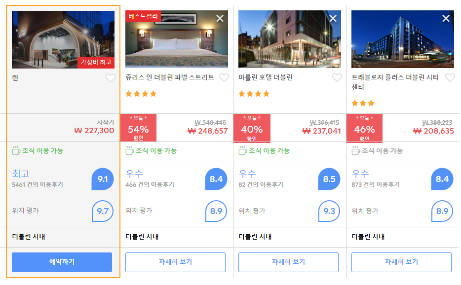 더블린호텔 렌 어반 네스트 (Wren Urban Nest)의 최저 가격대는 아고다웹사이트에서 할인특가 가격으로 매일매일 변동되며 20만원대부터 다양하게 형성됩니다. 날짜별로 매일 가격이 다르므로 아고다웹사이트 최저가를 확인하시려면 아래 링크를 누르시고 원하는 날짜의 가격대를 선택해야 정확한 가격을 자세히 보실 수 있습니다.