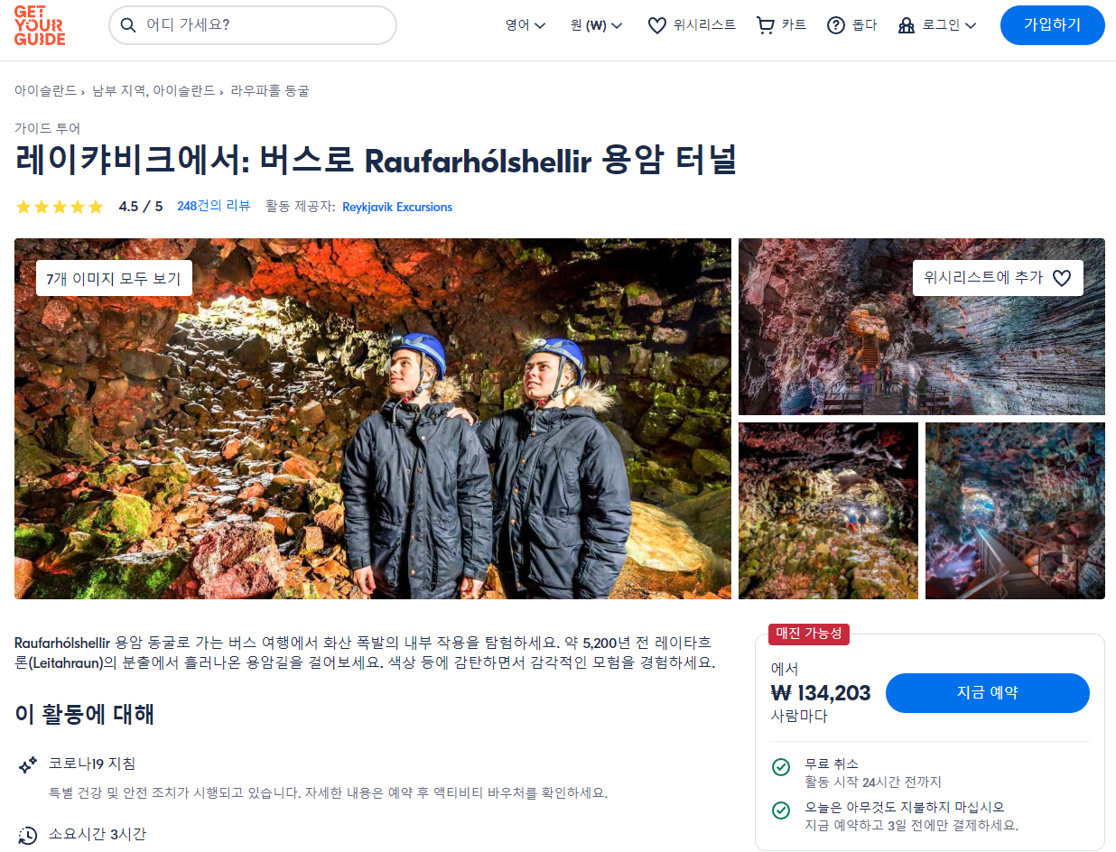 레이캬비크에서 버스로 Raufarhólshellir 용암 터널 여행은 GET YOUR GUIDE 사이트에서 예약하실 수 있습니다. 사이트는 특히 전세계 대부분의 나라, 지역의 투어, 교통편 있어, 쉽게 찾을 수 없는 여행지의 다양한 투어 및 서비스를 이용할 수 있는 글로벌 사이트로 한국어사이트는 지원하지 않습니다. (글로벌 한국어 여행사이트를 찾으신다면 klook 여행사이트 추천합니다. 함께 사용하시면 더욱 편하게 여행하실 수 있습니다. klook에 찾는 정보가 없다면 GET YOUR GUIDE에서 찾으시면 됩니다.)