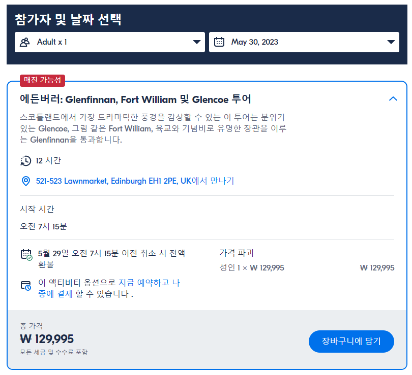 에든버러 Glenfinnan, Fort William 및 Glencoe 일일 투어 (Edinburgh Glenfinnan, Fort William, and Glencoe Day Tour)는 GET YOUR GUIDE 사이트에서 예약하실 수 있습니다. 사이트는 특히 전세계 대부분의 나라, 지역의 투어, 교통편 있어, 쉽게 찾을 수 없는 여행지의 다양한 투어 및 서비스를 이용할 수 있는 글로벌 사이트로 한국어사이트는 지원하지 않습니다. (글로벌 한국어 여행사이트를 찾으신다면 klook 여행사이트 추천합니다. 함께 사용하시면 더욱 편하게 여행하실 수 있습니다. klook에 찾는 정보가 없다면 GET YOUR GUIDE에서 찾으시면 됩니다.)