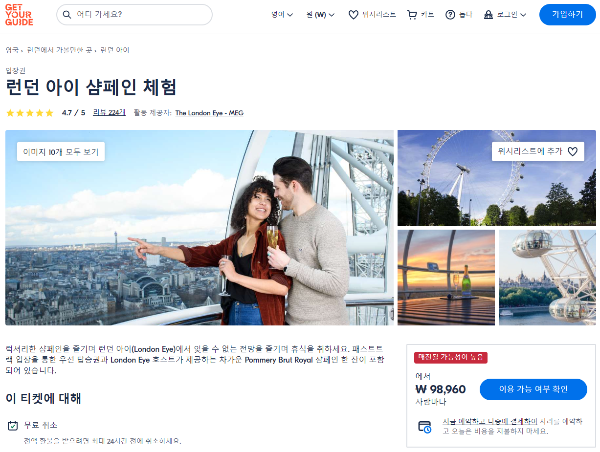 런던 아이 샴페인 체험(The London Eye Champagne Experience)는 GET YOUR GUIDE 사이트에서 예약하실 수 있습니다. 사이트는 특히 전세계 대부분의 나라, 지역의 투어, 교통편 있어, 쉽게 찾을 수 없는 여행지의 다양한 투어 및 서비스를 이용할 수 있는 글로벌 사이트로 한국어사이트는 지원하지 않습니다. (글로벌 한국어 여행사이트를 찾으신다면 klook 여행사이트 추천합니다. 함께 사용하시면 더욱 편하게 여행하실 수 있습니다. klook에 찾는 정보가 없다면 GET YOUR GUIDE에서 찾으시면 됩니다.)