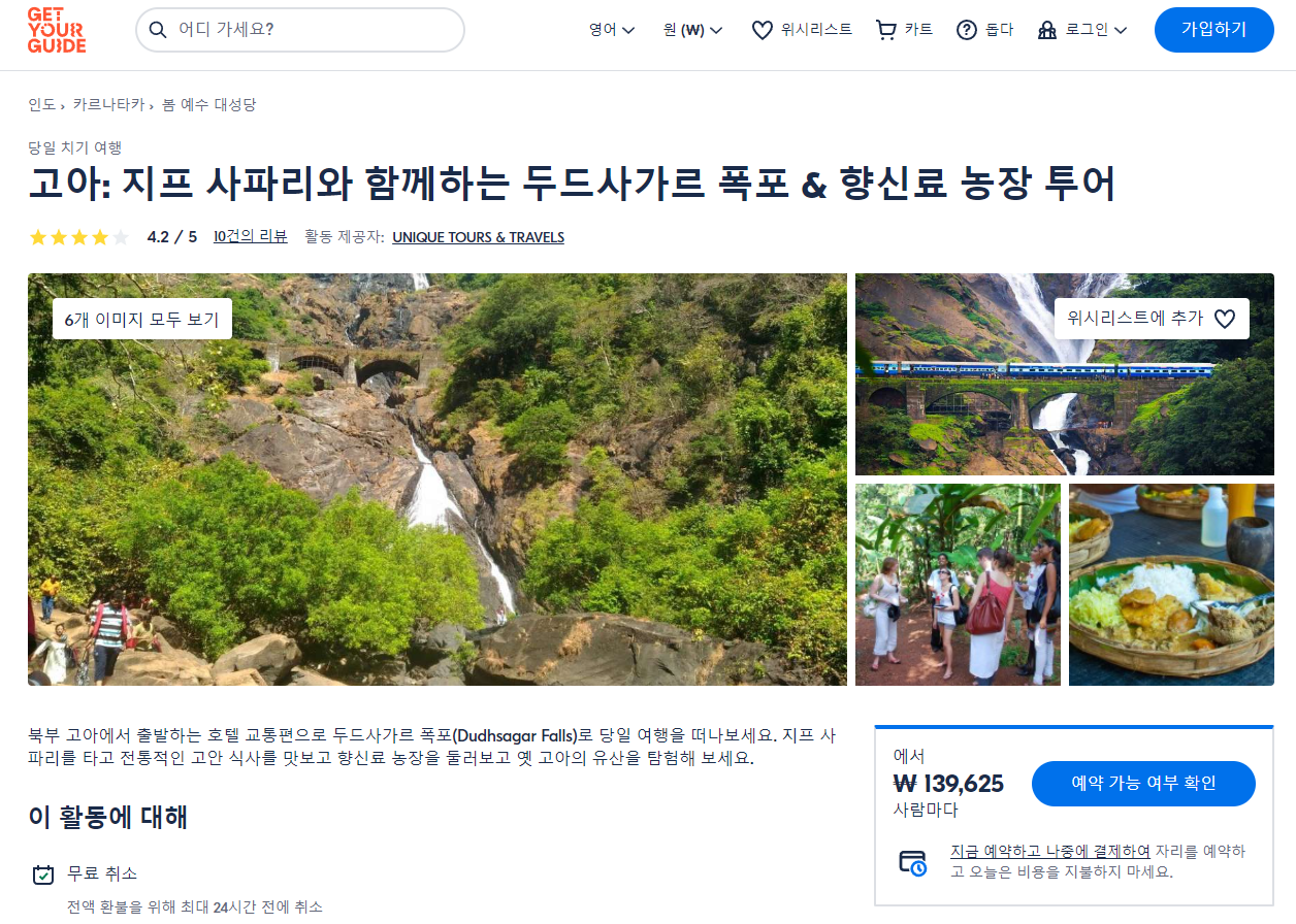 고아 지프 사파리와 함께하는 두드사가르 폭포 & 향신료 농장 투어 (Goa Dudhsagar Waterfall & Spice Farm Tour with Jeep Safari)는 GET YOUR GUIDE 사이트에서 예약하실 수 있습니다. 사이트는 특히 전세계 대부분의 나라, 지역의 투어, 교통편 있어, 쉽게 찾을 수 없는 여행지의 다양한 투어 및 서비스를 이용할 수 있는 글로벌 사이트로 한국어사이트는 지원하지 않습니다. (글로벌 한국어 여행사이트를 찾으신다면 klook 여행사이트 추천합니다. 함께 사용하시면 더욱 편하게 여행하실 수 있습니다. klook에 찾는 정보가 없다면 GET YOUR GUIDE에서 찾으시면 됩니다.)