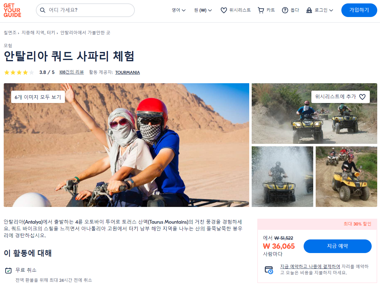 안탈리아 쿼드 사파리 체험(Antalya Quad Safari Experience)은 GET YOUR GUIDE 사이트에서 예약하실 수 있습니다. 사이트는 특히 전세계 대부분의 나라, 지역의 투어, 교통편 있어, 쉽게 찾을 수 없는 여행지의 다양한 투어 및 서비스를 이용할 수 있는 글로벌 사이트로 한국어사이트는 지원하지 않습니다. (글로벌 한국어 여행사이트를 찾으신다면 klook 여행사이트 추천합니다. 함께 사용하시면 더욱 편하게 여행하실 수 있습니다. klook에 찾는 정보가 없다면 GET YOUR GUIDE에서 찾으시면 됩니다.)