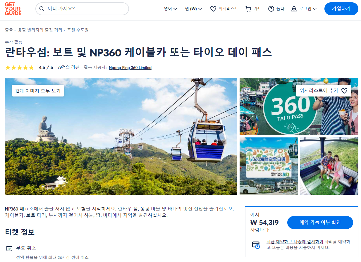란타우섬 보트 및 NP360 케이블카 또는 타이오 데이 패스(Lantau Island Boat and NP360 Cable Car or Tai O Day Pass)는 GET YOUR GUIDE 사이트에서 예약하실 수 있습니다. 사이트는 특히 전세계 대부분의 나라, 지역의 투어, 교통편 있어, 쉽게 찾을 수 없는 여행지의 다양한 투어 및 서비스를 이용할 수 있는 글로벌 사이트로 한국어사이트는 지원하지 않습니다. (글로벌 한국어 여행사이트를 찾으신다면 klook 여행사이트 추천합니다. 함께 사용하시면 더욱 편하게 여행하실 수 있습니다. klook에 찾는 정보가 없다면 GET YOUR GUIDE에서 찾으시면 됩니다.)
