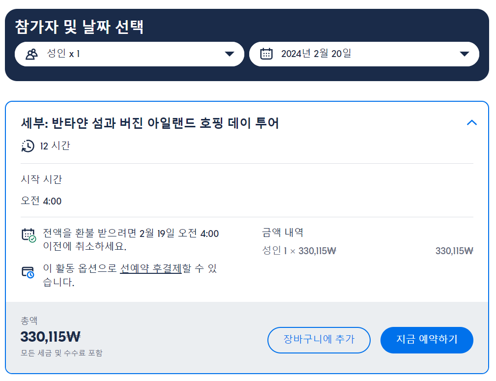 세부출발 반타얀과 버진 아일랜드 일일 현지투어는 GET YOUR GUIDE 사이트에서 예약하실 수 있습니다. 사이트는 특히 전세계 대부분의 나라, 지역의 투어, 교통편 있어, 쉽게 찾을 수 없는 여행지의 다양한 투어 및 서비스를 이용할 수 있는 글로벌 사이트로 한국어사이트는 지원하지 않습니다. (글로벌 한국어 여행사이트를 찾으신다면 klook 여행사이트 추천합니다. 함께 사용하시면 더욱 편하게 여행하실 수 있습니다. klook에 찾는 정보가 없다면 GET YOUR GUIDE에서 찾으시면 됩니다.)