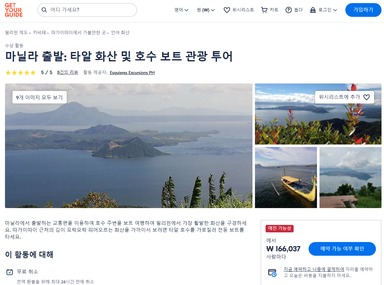 마닐라출발 타알 화산 및 호수 보트 관광 투어 (From Manila Taal Volcano and Lake Boat Sightseeing Tour)는 GET YOUR GUIDE 사이트에서 예약하실 수 있습니다. 사이트는 특히 전세계 대부분의 나라, 지역의 투어, 교통편 있어, 쉽게 찾을 수 없는 여행지의 다양한 투어 및 서비스를 이용할 수 있는 글로벌 사이트로 한국어사이트는 지원하지 않습니다. (글로벌 한국어 여행사이트를 찾으신다면 klook 여행사이트 추천합니다. 함께 사용하시면 더욱 편하게 여행하실 수 있습니다. klook에 찾는 정보가 없다면 GET YOUR GUIDE에서 찾으시면 됩니다.)
