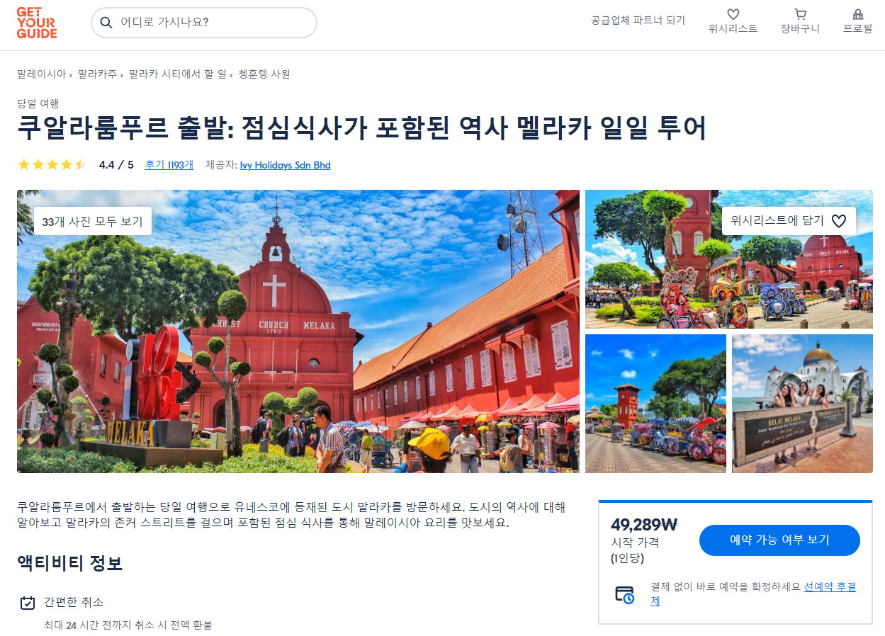 쿠알라룸푸르출발 멜라카 당일치기현지투어는 GET YOUR GUIDE 사이트에서 예약하실 수 있습니다. 사이트는 특히 전세계 대부분의 나라, 지역의 투어, 교통편 있어, 쉽게 찾을 수 없는 여행지의 다양한 투어 및 서비스를 이용할 수 있는 글로벌 사이트로 한국어사이트는 지원하지 않습니다. (글로벌 한국어 여행사이트를 찾으신다면 klook 여행사이트 추천합니다. 함께 사용하시면 더욱 편하게 여행하실 수 있습니다. klook에 찾는 정보가 없다면 GET YOUR GUIDE에서 찾으시면 됩니다.)