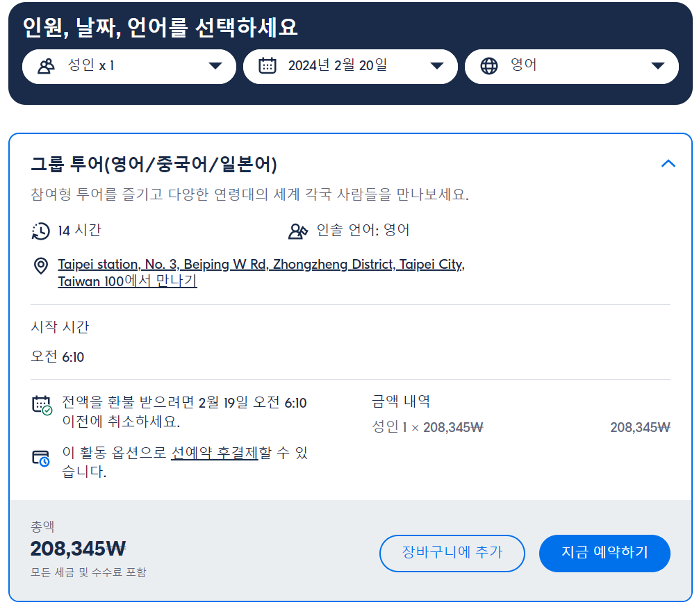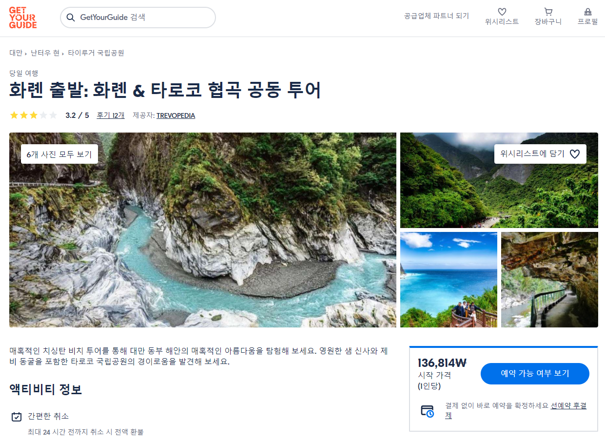 타로코 협곡 현지투어는 GET YOUR GUIDE 사이트에서 예약하실 수 있습니다. 사이트는 특히 전세계 대부분의 나라, 지역의 투어, 교통편 있어, 쉽게 찾을 수 없는 여행지의 다양한 투어 및 서비스를 이용할 수 있는 글로벌 사이트로 한국어사이트는 지원하지 않습니다. (글로벌 한국어 여행사이트를 찾으신다면 klook 여행사이트 추천합니다. 함께 사용하시면 더욱 편하게 여행하실 수 있습니다. klook에 찾는 정보가 없다면 GET YOUR GUIDE에서 찾으시면 됩니다.)