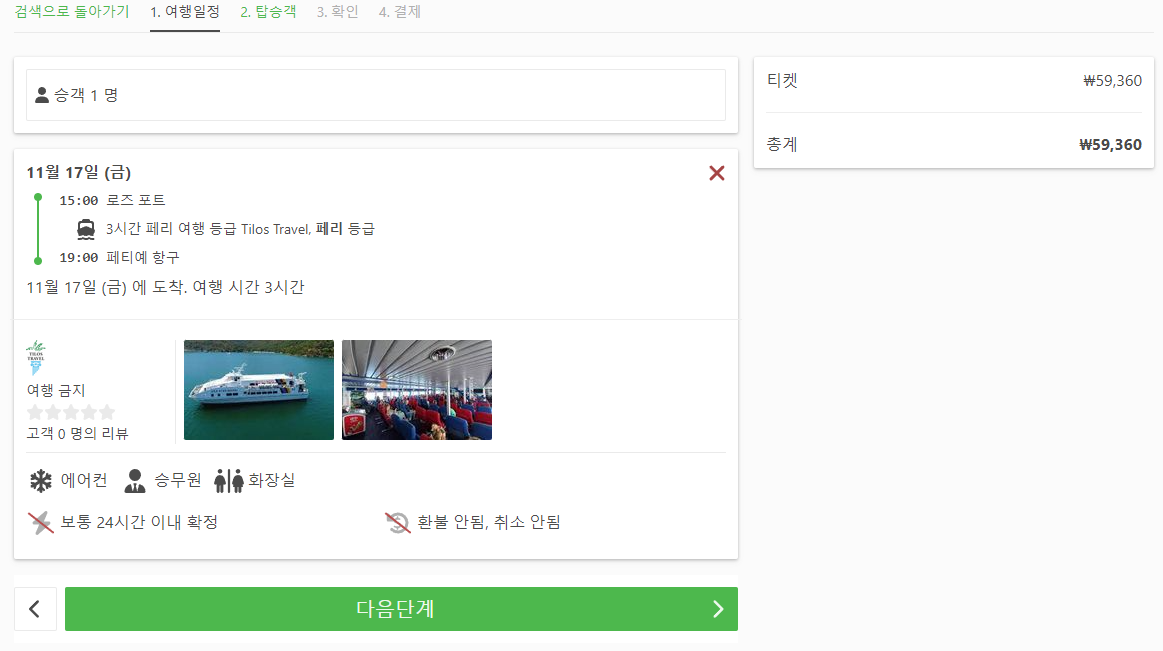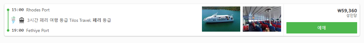 로데스에서 페티예로 페리는 로데스항구에서 페티예항구로 이동하며 요금은 3만대 ~ 5만원대에 형성되어 있습니다. 이동시간은 노선에 따라 1시간 45분 또는 3시간정도 소요됩니다.