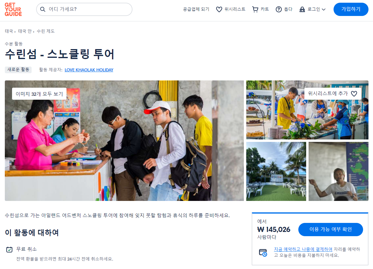 카오락출발 수린섬 국립공원 스노클링 투어(Surin Island Snorkeling Tour)는 GET YOUR GUIDE 사이트에서 예약하실 수 있습니다. 사이트는 특히 전세계 대부분의 나라, 지역의 투어, 교통편 있어, 쉽게 찾을 수 없는 여행지의 다양한 투어 및 서비스를 이용할 수 있는 글로벌 사이트로 한국어사이트는 지원하지 않습니다. (글로벌 한국어 여행사이트를 찾으신다면 klook 여행사이트 추천합니다. 함께 사용하시면 더욱 편하게 여행하실 수 있습니다. klook에 찾는 정보가 없다면 GET YOUR GUIDE에서 찾으시면 됩니다.)