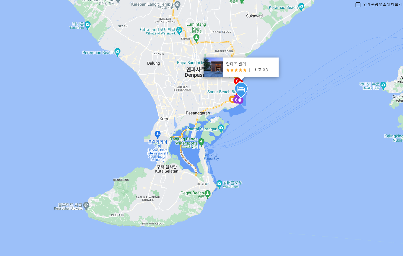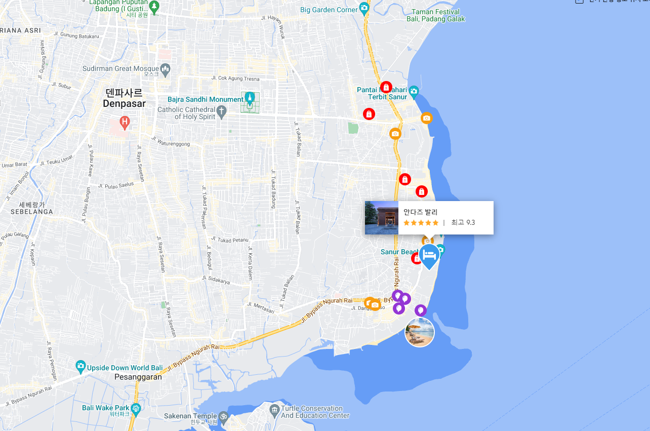 안다즈 발리가 위치한 사누르(sanur) 지역은 해변과 가깝고 대형 쇼핑몰, 맛집 등 다양한 볼거리와 가깝습니다.