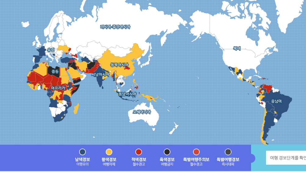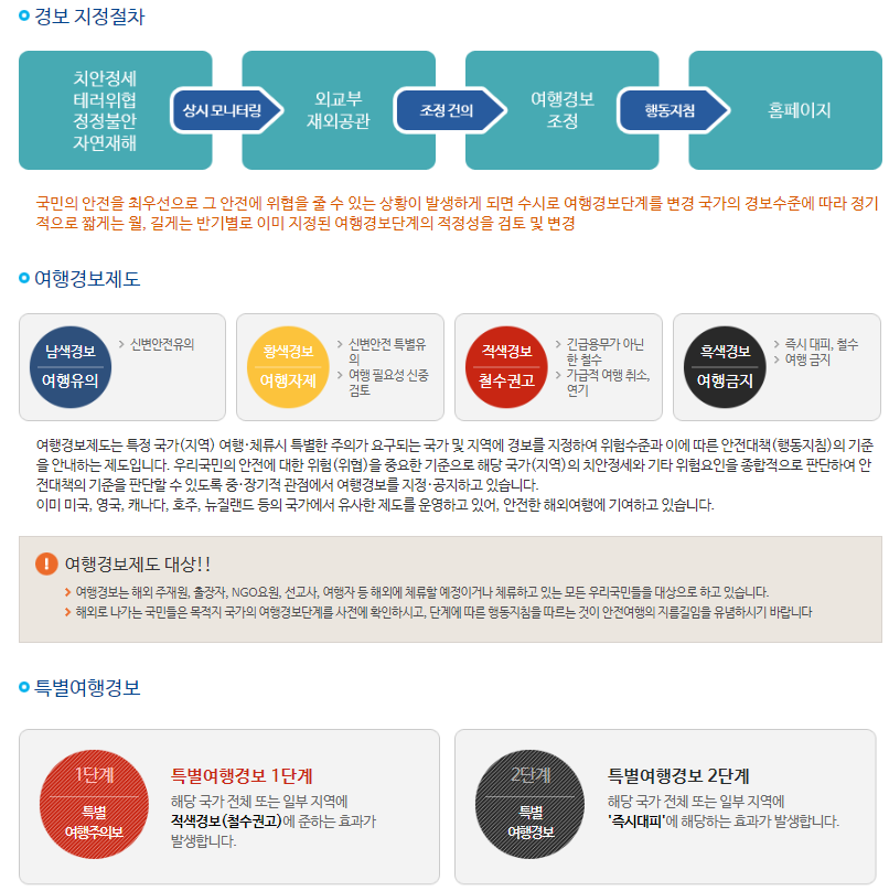- 1단계(남색경보) : (체류자) 신변안전 유의, (여행예정자) 여행 유의