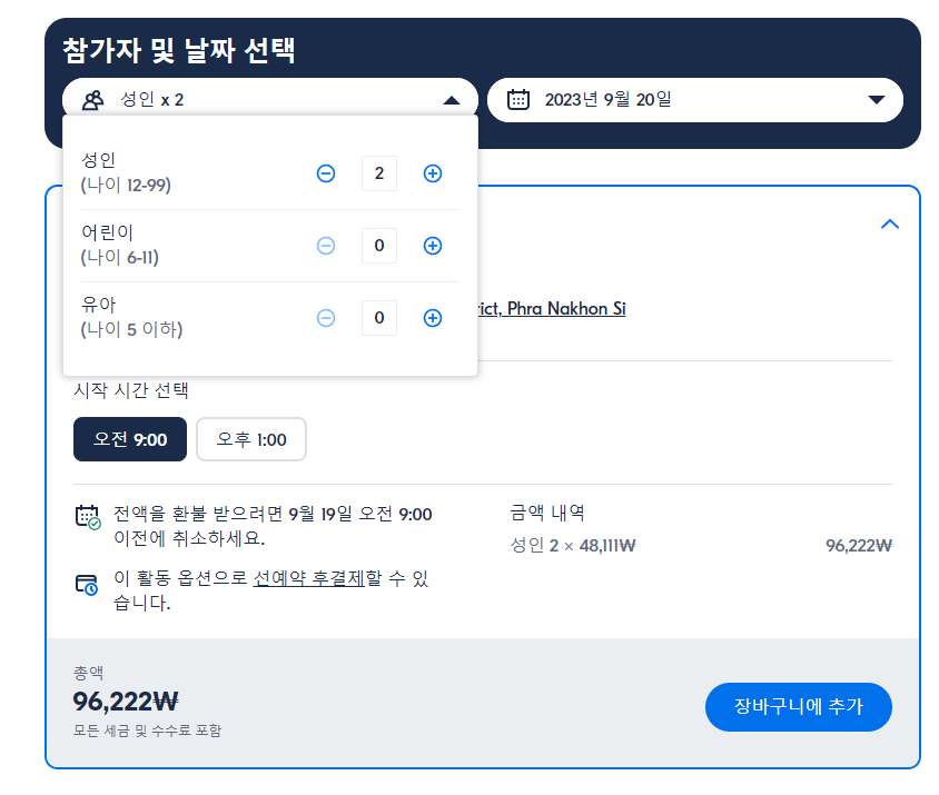 아유타야 시내 및 역사 공원 자전거 투어는 GET YOUR GUIDE 사이트에서 예약하실 수 있습니다. 사이트는 특히 전세계 대부분의 나라, 지역의 투어, 교통편 있어, 쉽게 찾을 수 없는 여행지의 다양한 투어 및 서비스를 이용할 수 있는 글로벌 사이트로 한국어사이트는 지원하지 않습니다. (글로벌 한국어 여행사이트를 찾으신다면 klook 여행사이트 추천합니다. 함께 사용하시면 더욱 편하게 여행하실 수 있습니다. klook에 찾는 정보가 없다면 GET YOUR GUIDE에서 찾으시면 됩니다.)