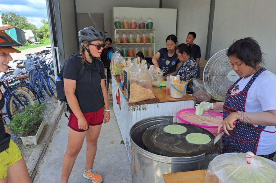 페달을 밟으며 동네를 지나 이스트를 넣지 않은 빵에 야자 설탕을 실로 감싼 맛있는 디저트인 로티 사이 마이를 파는 상인들을 지나쳐 보세요. 자전거를 타고 체디 프라 시 수리요타이까지 가서 솜뎃 프라 스리나카린다 공원의 평화를 경험한 후 강변을 따라 계속 달리면 야자수 잎으로 모빌을 만드는 무슬림 커뮤니티를 발견할 수 있습니다.