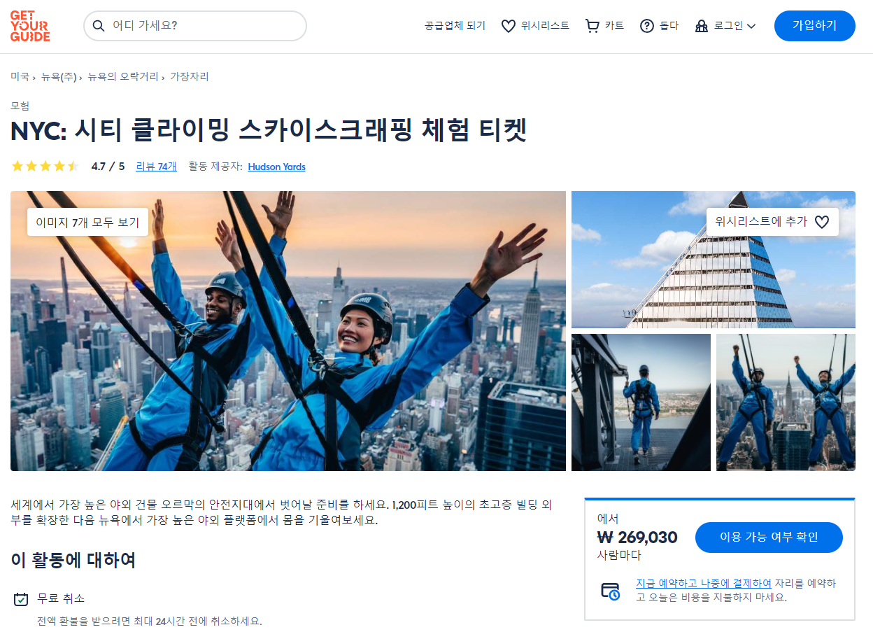 NYC 시티 클라이밍 고층 빌딩 체험 티켓(NYC City Climb Skyscraping Experience Ticket)은 GET YOUR GUIDE 사이트에서 예약하실 수 있습니다. 사이트는 특히 전세계 대부분의 나라, 지역의 투어, 교통편 있어, 쉽게 찾을 수 없는 여행지의 다양한 투어 및 서비스를 이용할 수 있는 글로벌 사이트로 한국어사이트는 지원하지 않습니다. (글로벌 한국어 여행사이트를 찾으신다면 klook 여행사이트 추천합니다. 함께 사용하시면 더욱 편하게 여행하실 수 있습니다. klook에 찾는 정보가 없다면 GET YOUR GUIDE에서 찾으시면 됩니다.)
