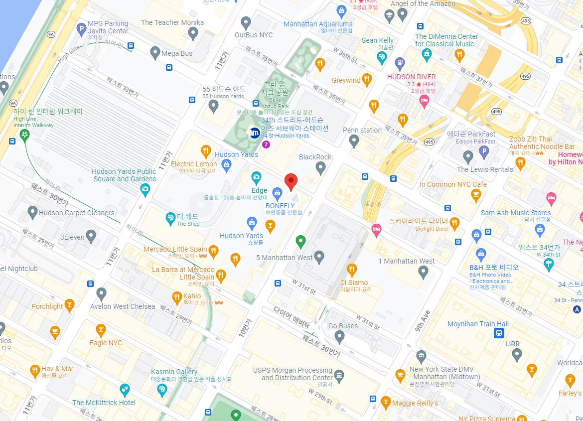 • Hudson Yards의 상점 및 레스토랑 입구는 10번가를 따라 또는 Hudson Yards Plaza를 통해 있습니다.