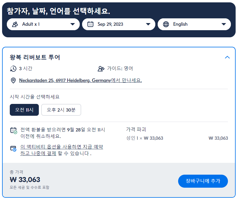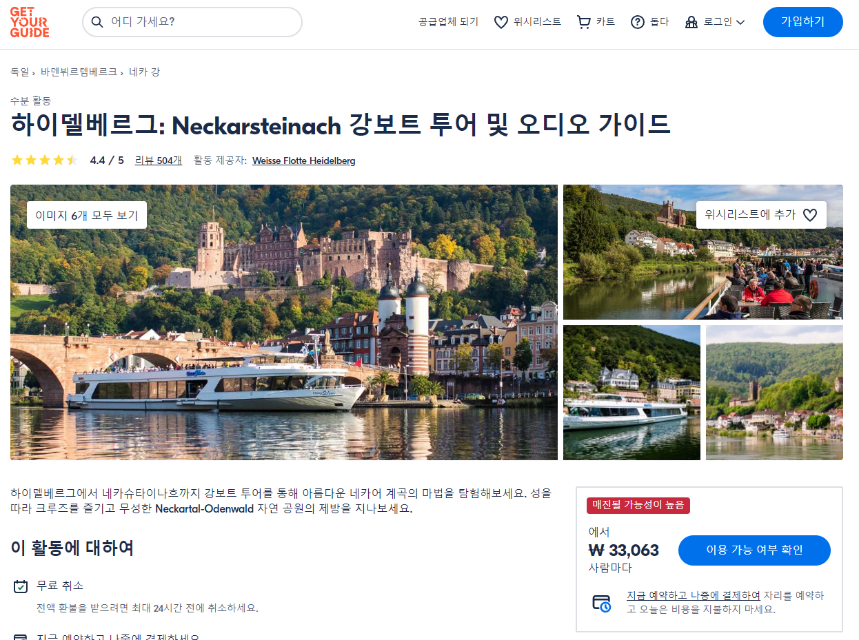 하이델베르크 네카슈타나흐 강 보트 투어 및 오디오 가이드 (Heidelberg Riverboat Tour to Neckarsteinach and Audio Guide)는 GET YOUR GUIDE 사이트에서 예약하실 수 있습니다. 사이트는 특히 전세계 대부분의 나라, 지역의 투어, 교통편 있어, 쉽게 찾을 수 없는 여행지의 다양한 투어 및 서비스를 이용할 수 있는 글로벌 사이트로 한국어사이트는 지원하지 않습니다. (글로벌 한국어 여행사이트를 찾으신다면 klook 여행사이트 추천합니다. 함께 사용하시면 더욱 편하게 여행하실 수 있습니다. klook에 찾는 정보가 없다면 GET YOUR GUIDE에서 찾으시면 됩니다.)