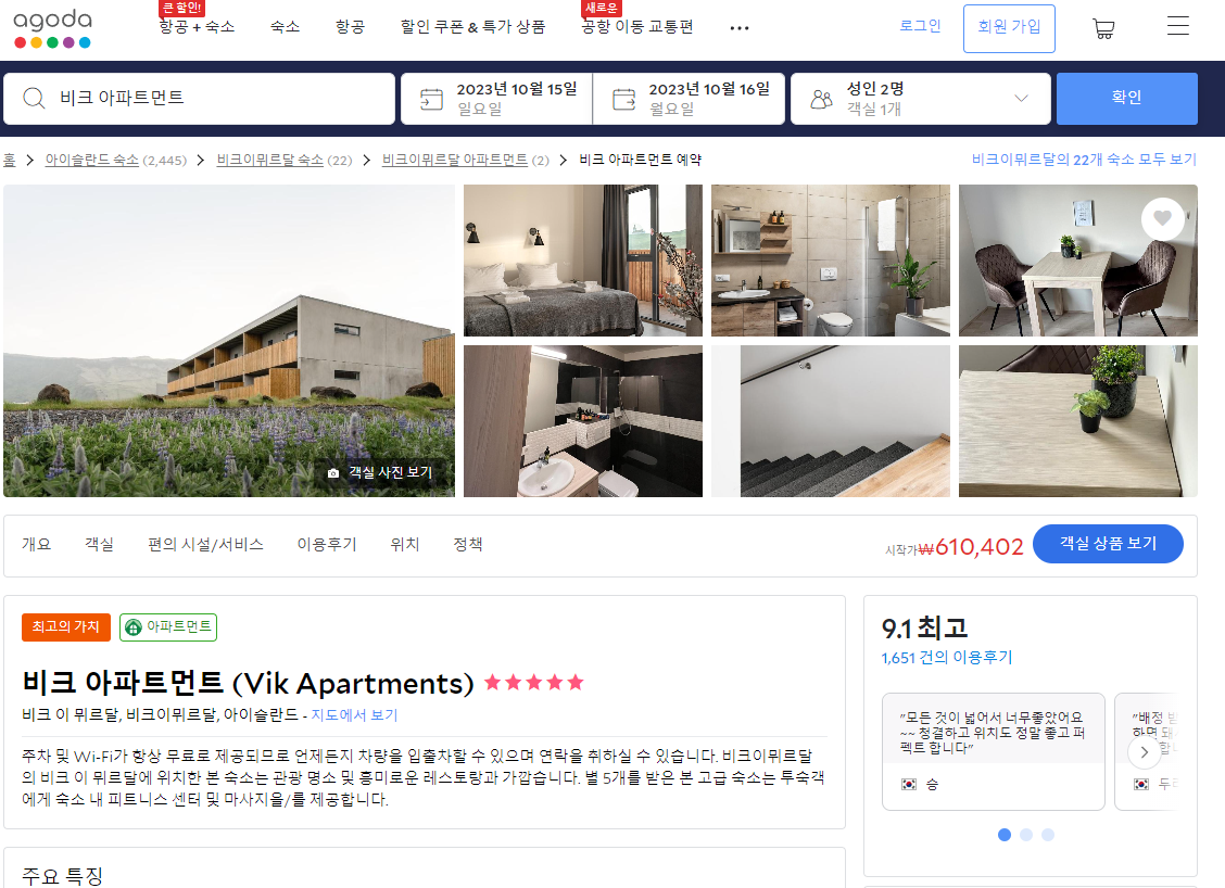 아이슬란드 비크이뮈르달숙소 비크 아파트먼트 (Vik Apartments)의 최저 가격대는 아고다웹사이트에서 할인특가 가격으로 매일매일 변동되며 10만원대부터 다양하게 형성됩니다. 날짜별로 매일 가격이 다르므로 아고다웹사이트 최저가를 확인하시려면 아래 링크를 누르시고 원하는 날짜의 가격대를 선택해야 정확한 가격을 자세히 보실 수 있습니다.