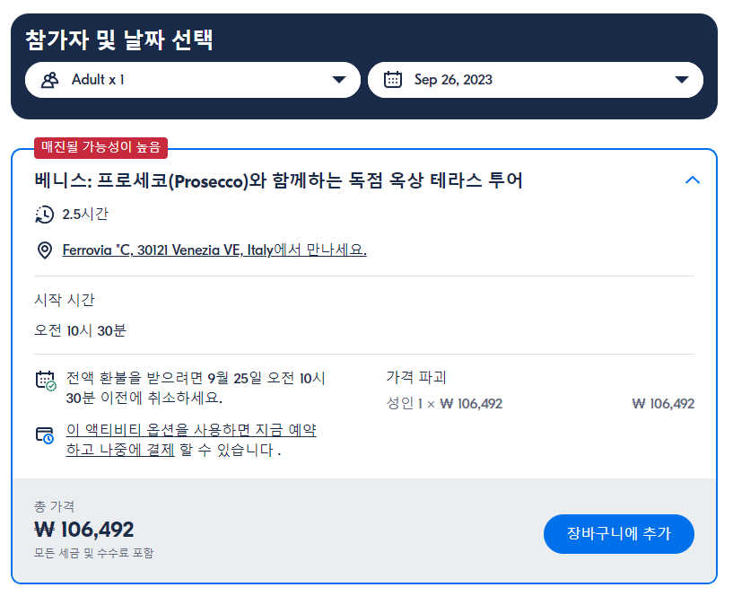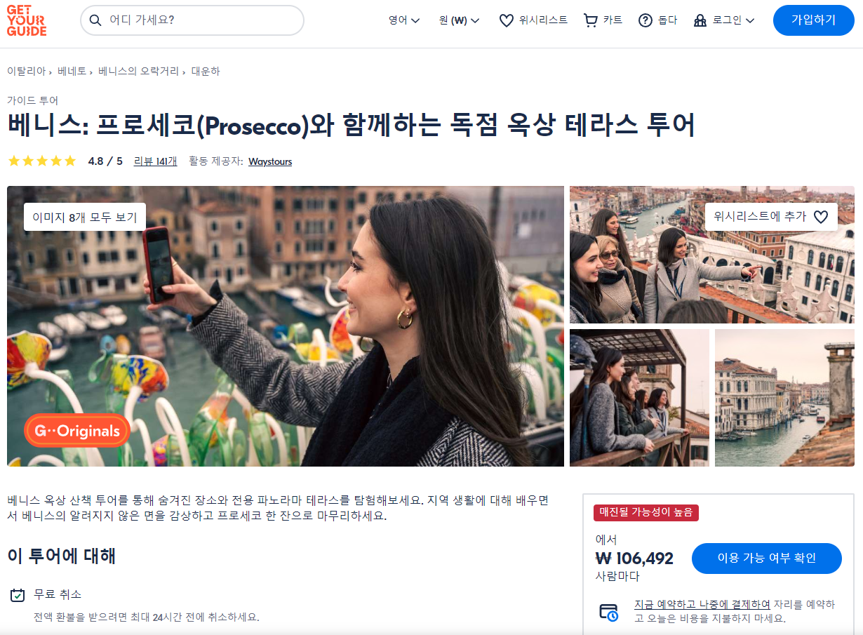 베니스 프로세코(Prosecco)와 함께하는 독점 옥상 테라스 투어(Venice Exclusive Rooftop Terraces Tour with Prosecco)는 GET YOUR GUIDE 사이트에서 예약하실 수 있습니다. 사이트는 특히 전세계 대부분의 나라, 지역의 투어, 교통편 있어, 쉽게 찾을 수 없는 여행지의 다양한 투어 및 서비스를 이용할 수 있는 글로벌 사이트로 한국어사이트는 지원하지 않습니다. (글로벌 한국어 여행사이트를 찾으신다면 klook 여행사이트 추천합니다. 함께 사용하시면 더욱 편하게 여행하실 수 있습니다. klook에 찾는 정보가 없다면 GET YOUR GUIDE에서 찾으시면 됩니다.)