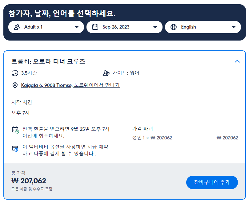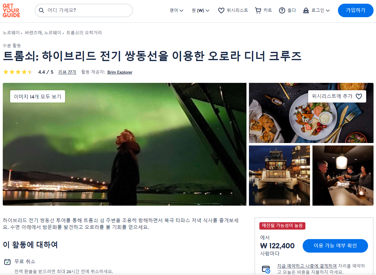 트롬쇠 하이브리드 전기 쌍동선을 이용한 오로라 디너 크루즈(Tromsø Aurora Dinner Cruise by Hybrid-Electric Catamaran)는 GET YOUR GUIDE 사이트에서 예약하실 수 있습니다. 사이트는 특히 전세계 대부분의 나라, 지역의 투어, 교통편 있어, 쉽게 찾을 수 없는 여행지의 다양한 투어 및 서비스를 이용할 수 있는 글로벌 사이트로 한국어사이트는 지원하지 않습니다. (글로벌 한국어 여행사이트를 찾으신다면 klook 여행사이트 추천합니다. 함께 사용하시면 더욱 편하게 여행하실 수 있습니다. klook에 찾는 정보가 없다면 GET YOUR GUIDE에서 찾으시면 됩니다.)