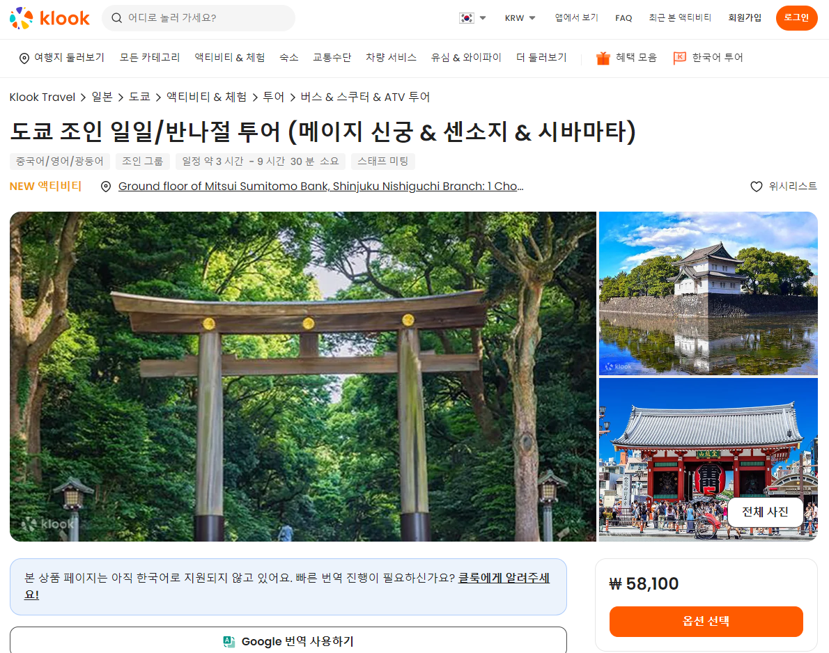 도쿄 메이지 신궁, 센소지, 시바마타 조인투어는 클룩사이트에서 쉽게 예약하실 수 있으며, 현재 할인된 금액에 이용하실 수 있습니다.