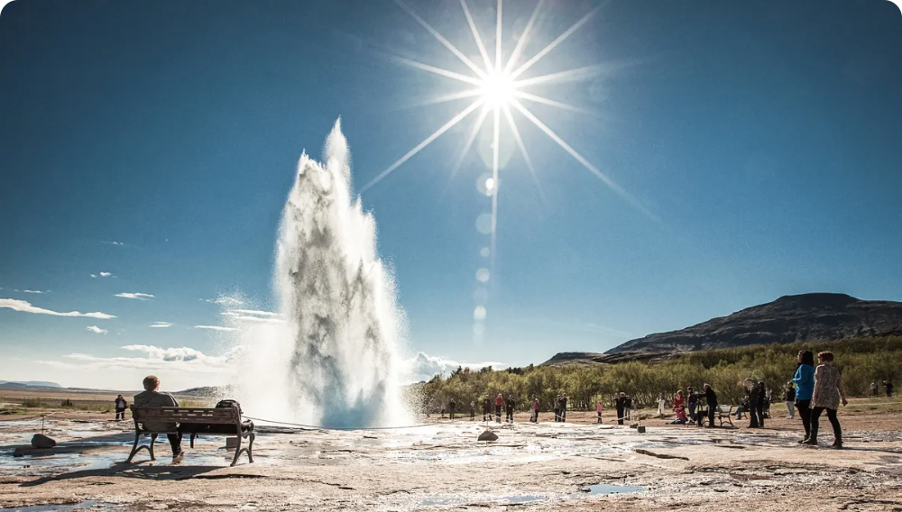 영어 단어 'geyser(간헐천)'의 어원이 된 곳입니다. 게이시르 자체는 현재 활동이 멈췄지만, 인근의 스트로쿠르(Strokkur) 간헐천은 여전히 활발하게 활동하고 있어 약 5-10분 간격으로 뜨거운 물을 하늘로 분출합니다.