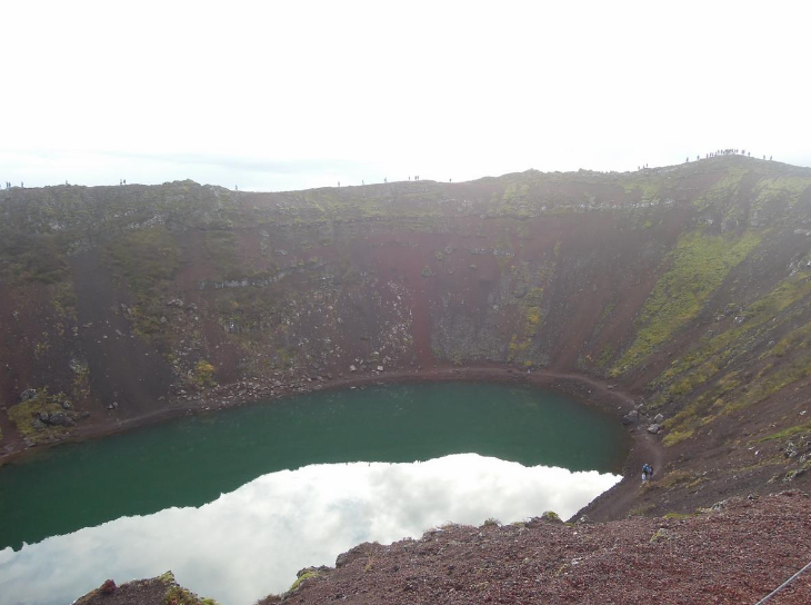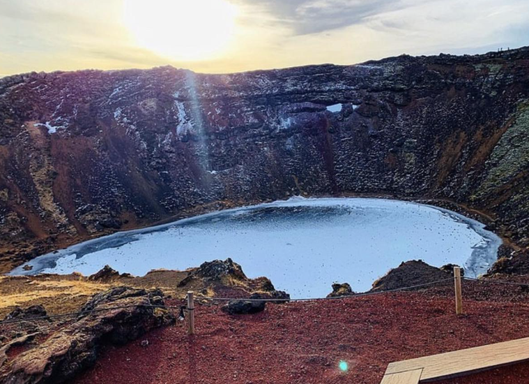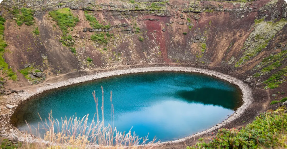 케리드 분화구(Kerið Crater)는 아이슬란드의 유명한 자연 명소 중 하나로, 레이캬비크에서 약 55km 동쪽에 위치해 있습니다. 이 분화구는 골든 서클 루트에 포함되기도 하며, 붉은 화산암과 푸른 물이 어우러진 독특한 경관으로 많은 관광객들이 찾습니다.