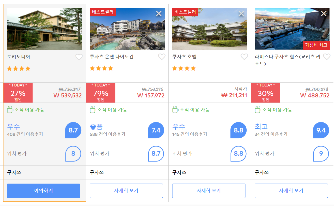 구사츠료칸 토키노니와 (Tokinoniwa Hotel)의 최저 가격대는 아고다웹사이트에서 할인특가 가격으로 매일매일 변동되며 50만원대부터 다양하게 형성됩니다. 날짜별로 매일 가격이 다르므로 아고다웹사이트 최저가를 확인하시려면 아래 링크를 누르시고 원하는 날짜의 가격대를 선택해야 정확한 가격을 자세히 보실 수 있습니다.