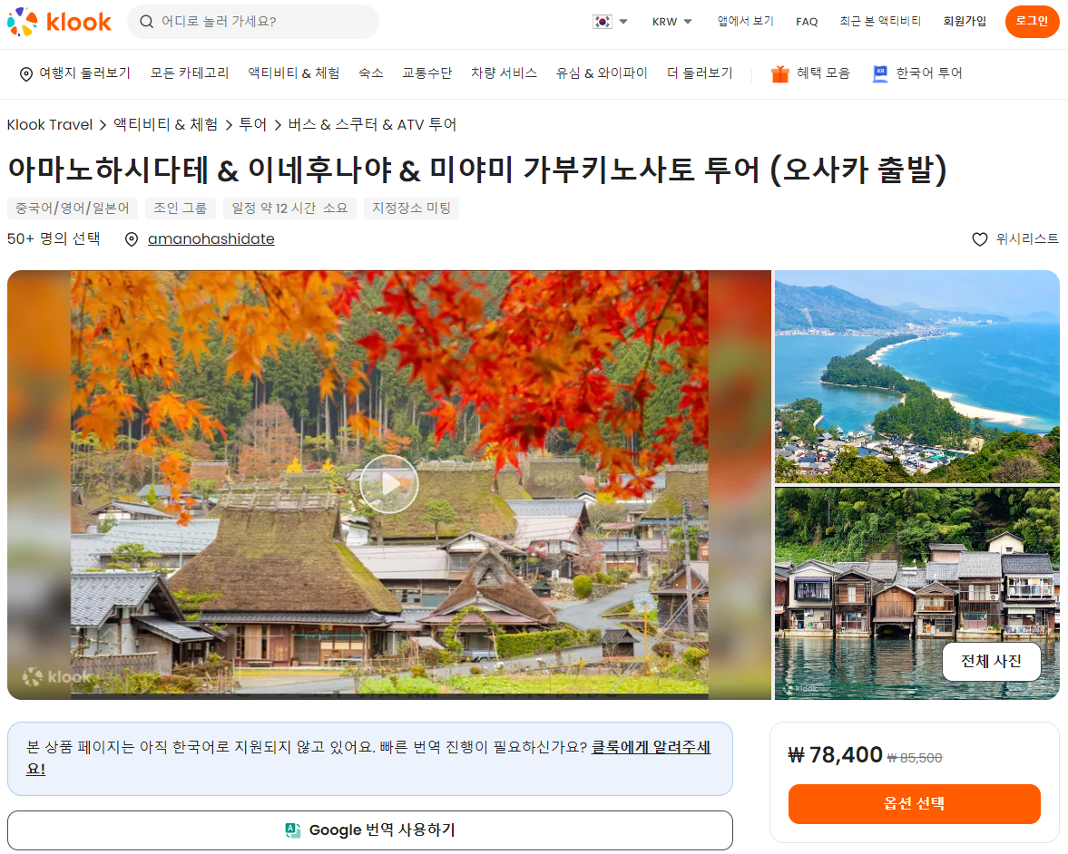 오사카출발 미야미 가부키노사토와 아마노하시다테, 이네후나야 일일투어는 클룩사이트에서 쉽게 예약하실 수 있으며, 현재 할인된 금액에 이용하실 수 있습니다.