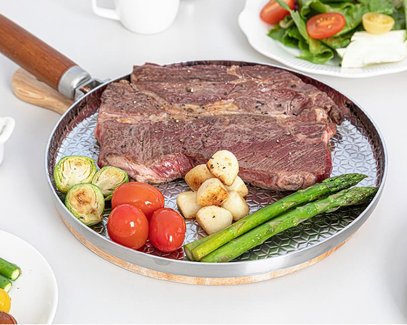 조리후 플레이팅까지 완벽한 실버스타허니비 통5중 인덕션 IH 스테이크팬으로 캠핑, 홈파티를 더욱 분위기 있게 만들어 줍니다.